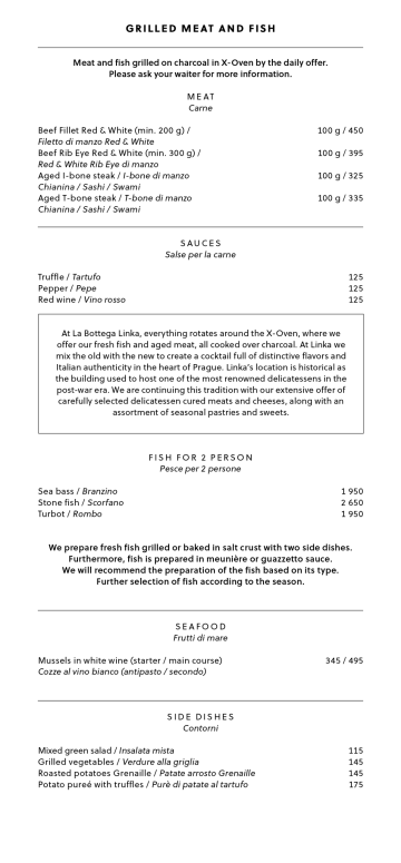 All prices are in Czech crowns and inluding VAT. Service charge of 12, 5 % will be added to the final bill for the groups of 8 and more guests.