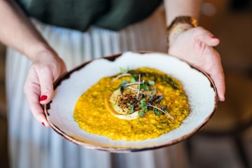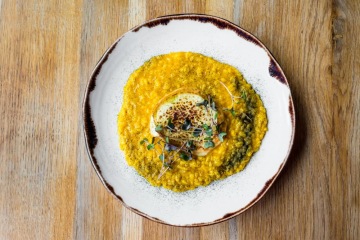 We certainly can’t miss pumpkin on an Autumn menu, and we have it as a freshly made Italian pumpkin risotto with grilled scamorza and curly kale dust.