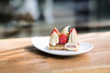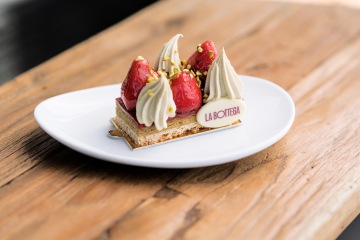After a year off, we welcome back Giardino di fragole, a dessert in a light almond pastry, fluffy pistachio base, homemade strawberry compote, pistachio cream and fresh strawberries.