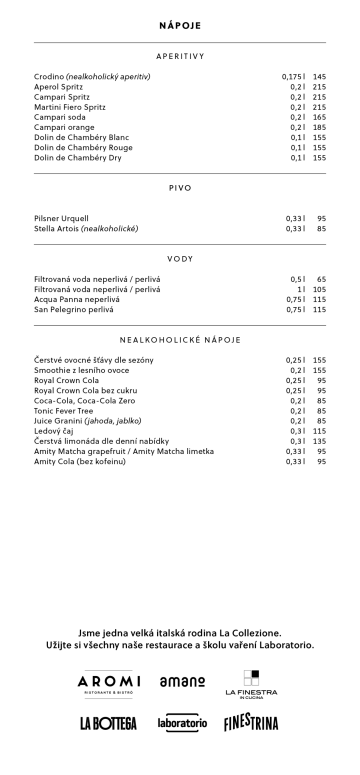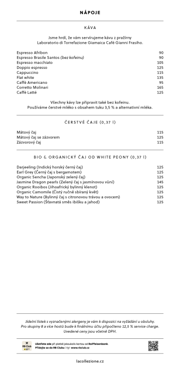 Pro skupiny osmi a více osob bude k finálnímu účtu připočítáno 12,5 % service charge. Uvedené ceny jsou v Kč včetně DPH.