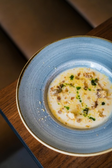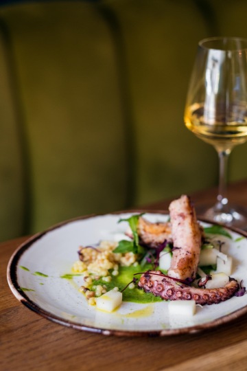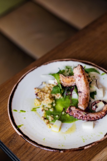 A dejte si také filé ze sumečka připravené v sous vide, s jogurtem, chřestem, koprovým olejem a ředkví daikon a grilovanou chobotnici s fregolou, mizunou, žlutým melounem, ředkví a omáčkou z řeřichy potočnice.
