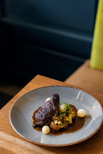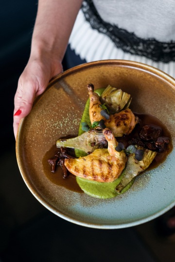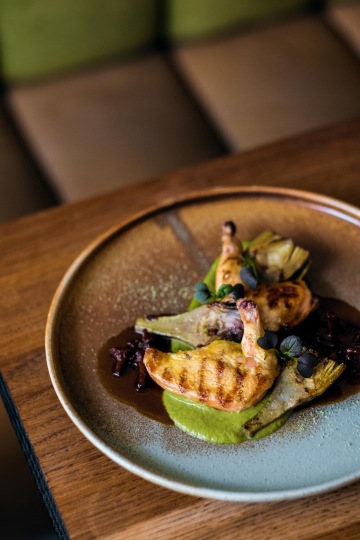 A přejděme k hlavním chodům, jeden je lepší než druhý a ani sám šéfkuchař nemohl vybrat jeden, který byste měli zkusit. Zveme vás proto na všechny. Grilované jarní baby kuřátko s pórkovým pyré, artyčoky, liškami a libečkovou solí i pečená telecí líčka s novými bramborami, lardem, řeřichou a marinovanými cibulkami s pomerančovou kůrou a sečuánským pepřem.
