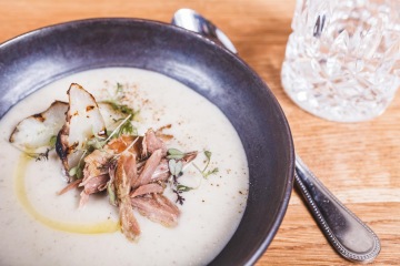 Topinamburová polévka, lanýž, konfitovaná kachna