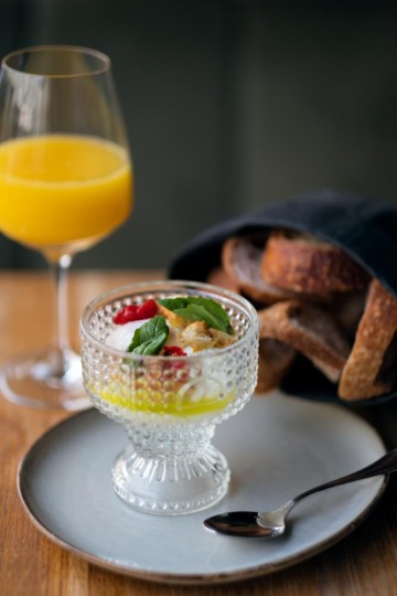 Začneme tradičně snídaní. Co je nového na lístku? Vejce do skla není nutno dlouze představovat. Protože kdo je jednou ochutnal, moc dobře ví, že jsou luxusní a co teprve vejce do skla s pažitkovým máslem, parmazánovými krutony a cherry rajčátky.