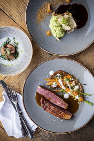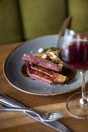 Kachní prso s omáčkou z kachního jusu, sečuánského pepře s pomerančovým juicem a kapkou Metaxy. Podáváme jej s mladou karotkou a tekutou bruschettou. A co je tekutá bruschetta? Chleba upečeme hodně dotmava, přidáme do něj olivový olej, konfitovaný česnek a sušená rajčata.