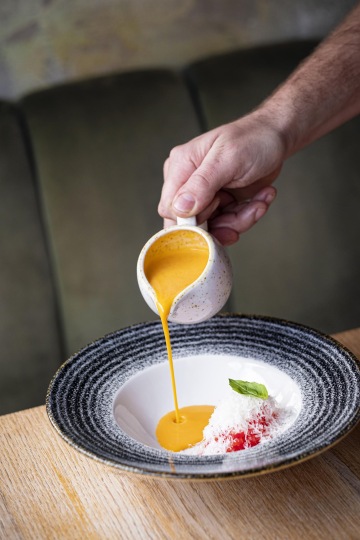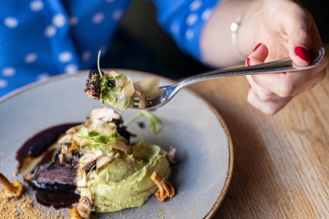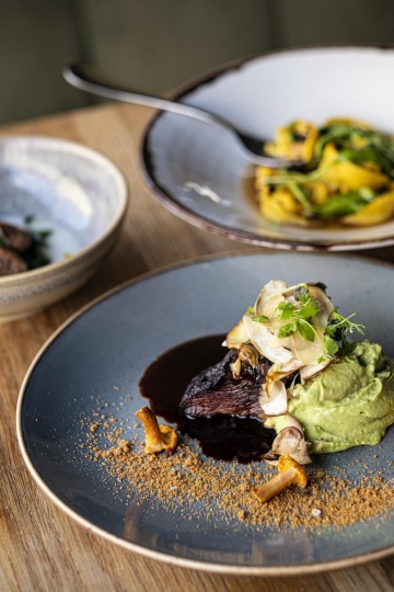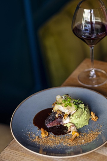 Hovězí žebro dělané přes noc s cibulí, balsamicem, červeným vínem a uzeným pepřem, doděláváme v x-oven. Servírujeme jej s omáčkou z uzeného pepře, carpacciem z hříbků a avokádem, marinovanými liškami a cibulovým prachem.