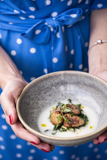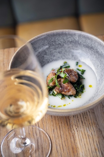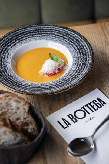 Jako předkrm vám nabídneme Acqua di pecorino, pro jehož přípravu používáme mladé pecorino primo sale, s restovaným brzlíkem a mangoldem.
