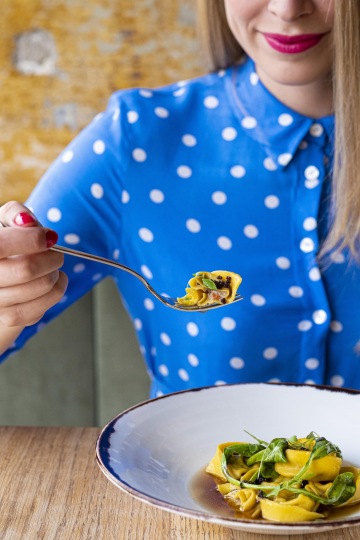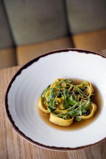 Novinkou mezi pastou jsou tortellini plněné masem z humra a artyčoky, vše podáváme s výrazným vývarem z korýšů, černým kaviárem a mořskou levandulí, která dodává slanost a křupavost.