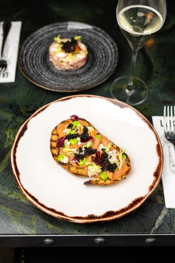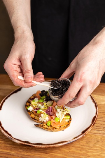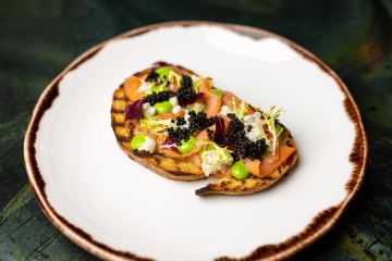 Bruschetta s uzeným lososem, pažitkovou majonézou, nakládaným květákem a kaviár
