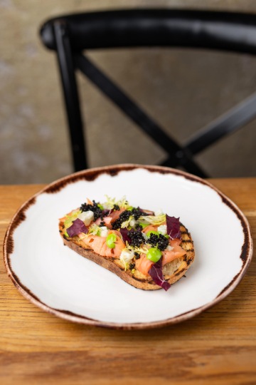 Bruschetta with smoked salmon, chive mayonnaise, pickled cauliflower and caviar