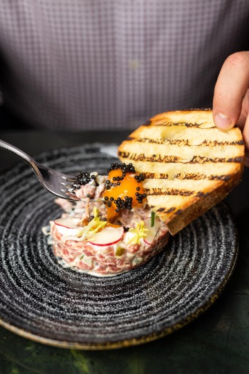 Telecí tatarák s uzeným créme fraîche, žloutek 63 °C, grissini a kaviár